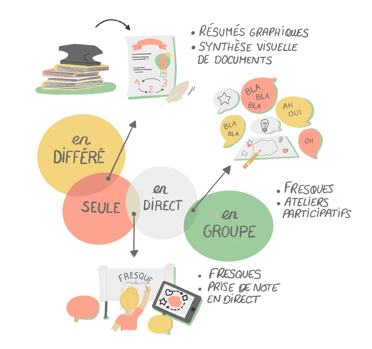 Designer graphique, illustratrice et facilitatrice graphique indépendante basée dans les Hautes-Alpes, je me spécialise dans la création de logos, l’image de marque, le design d’emballage, l’illustration et la mise en image de vos pensées.